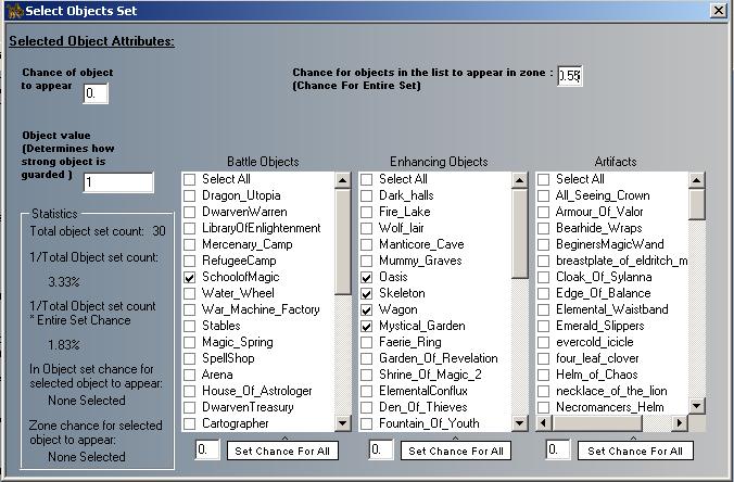 On the left upper area you can see 2 input fields - both are spacific for a single object you select by left clicking the mouse on top of the object , The chance basically detemines the when the object will appear in current object set , So for example 0.0 means the object will not appear in this object set - basically to remove object from this set simply deselect it using double left click , Same effect as manually settings the chance for 0.0 .